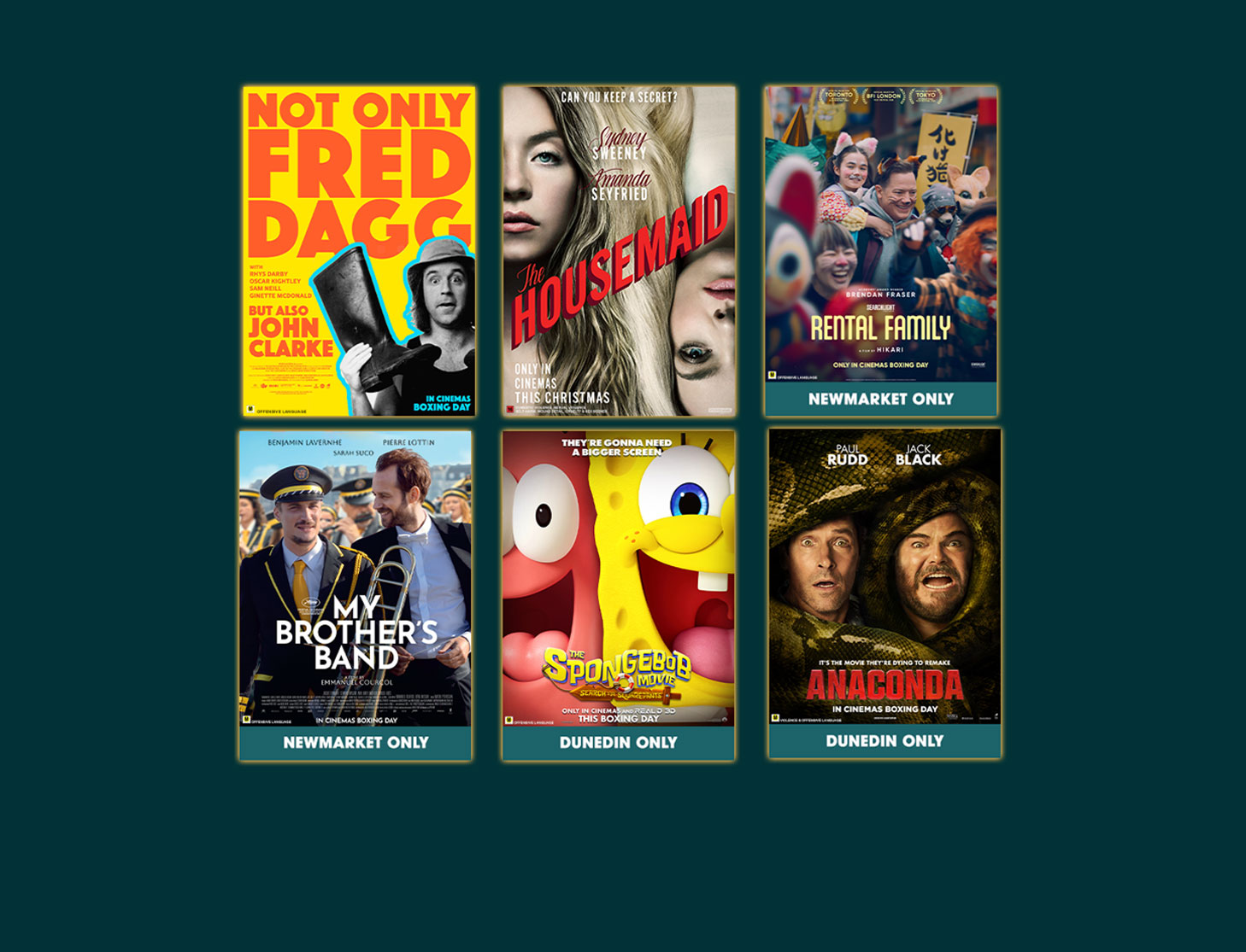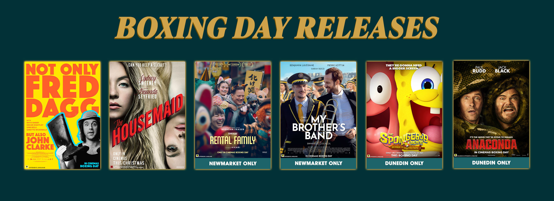 Aucklanders can see film festival audience favourite RENTAL FAMILY starring Brendan Fraser, and Cannes sensation MY BROTHER'S BAND. Dunedin gets some family fun with THE SPONGEBOB MOVIE: SEARCH FOR SQUAREPANTS and ANACONDA.